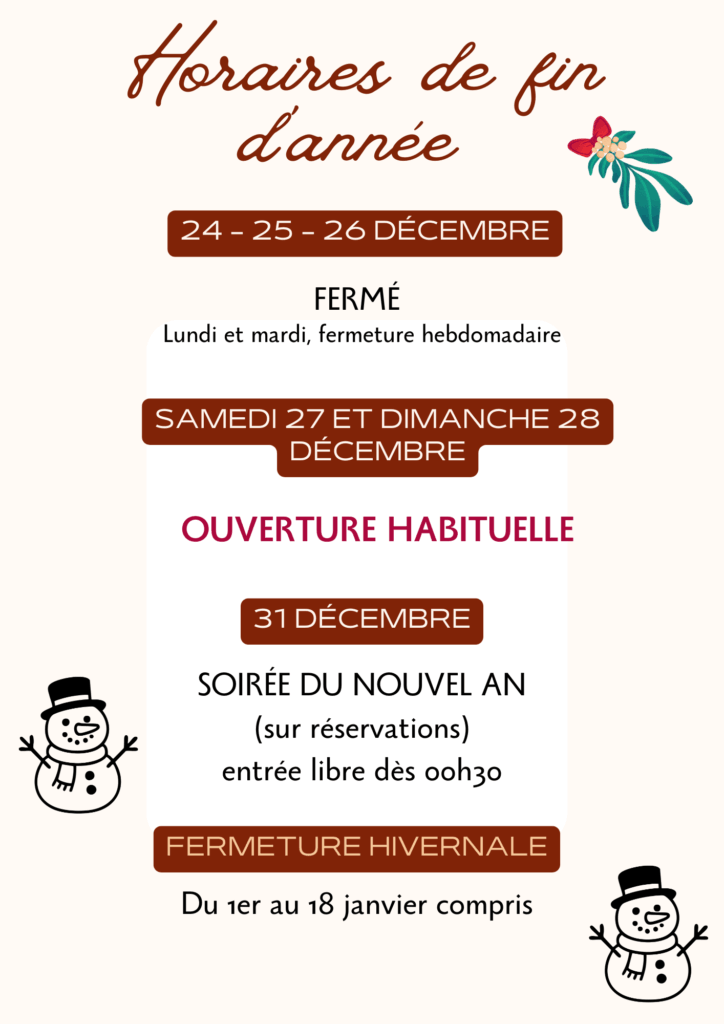 Horaires des fêtes : FERME du 24 au 26 décembre compris. Ouverture habituelle le samedi 27 et dimanche 28 décembre. Mercredi 31 décembre : Soirée du nouvel an (sur réservations)